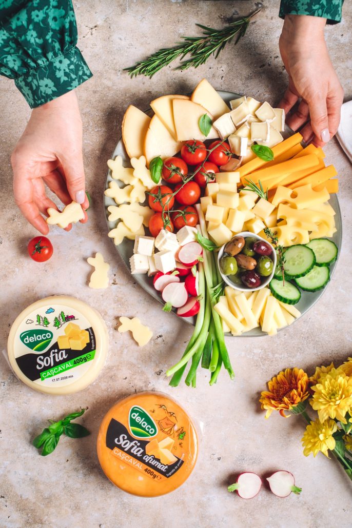 • mici detalii tematice (forme festive- precum cașcavalul Sofia decupat în formă de iepuraș, dacă vrei să duci platoul la nivelul următor)